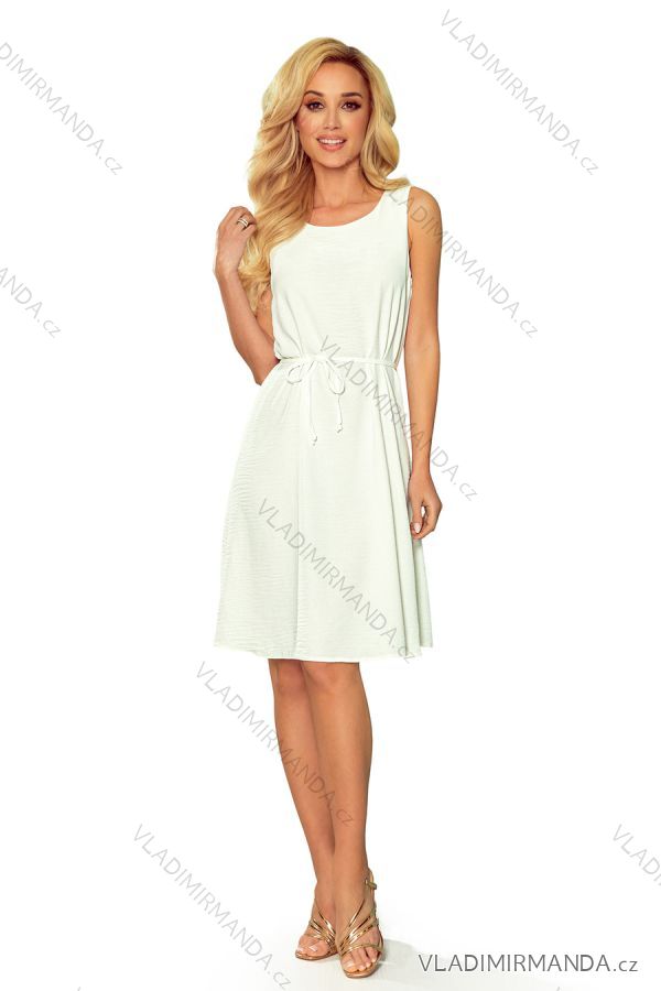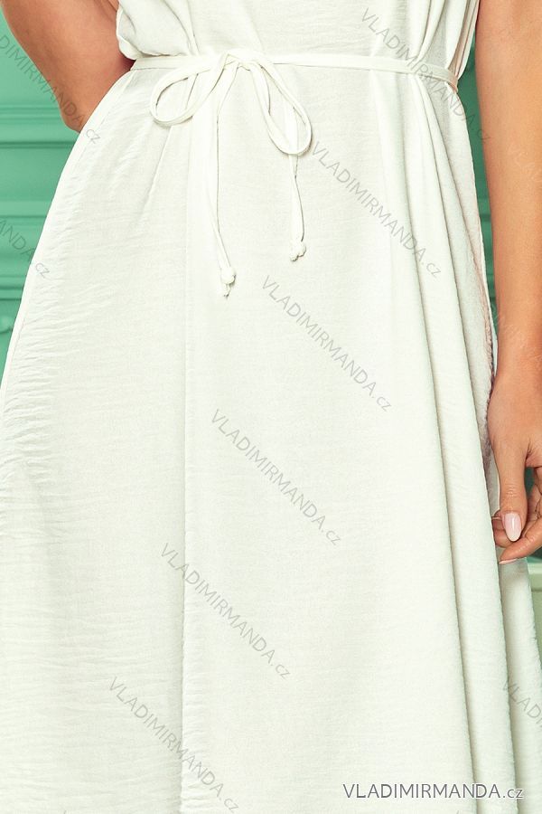 Victoria - lockeres trapezförmiges Kleid mit Gürtel. Hergestellt aus zerkleinertem ecru-farbigem Material. Numoco Marke. Polnische Produktion. Zusammensetzung: 95% Polyester, 5% Elasthan.