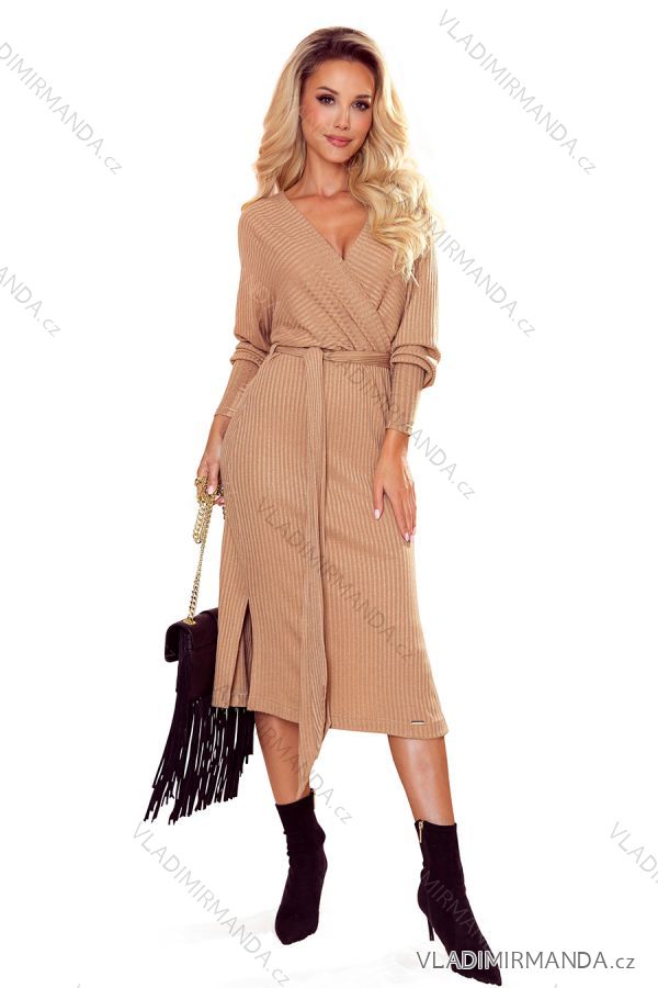 Wickelkleid mit Krawatte. Aus angenehm zu berührendem beigem Material (95% Acryl, 5% Elasthan). Marke Numoco. Polnische Produktion.