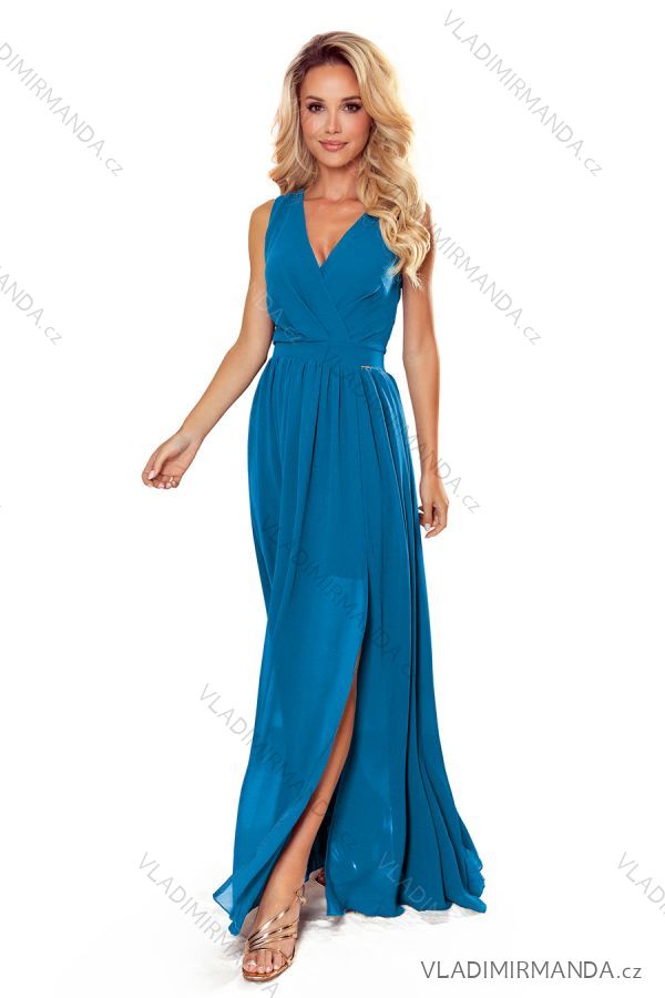 Justine - ein langes Kleid mit Ausschnitt, einem Schlitz am Bein und einer Krawatte auf der Rückseite. Aus luftigem Material in der Farbe Blau. Hinten mit verdecktem Reißverschluss zu schließen. Polnisches Produkt. Numoco-Marke.