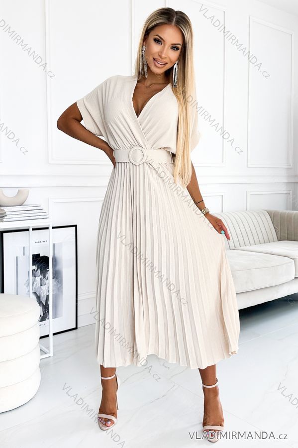 471-1 FELICIA Plissiertes Midikleid mit Ausschnitt und breitem Gürtel – Beige