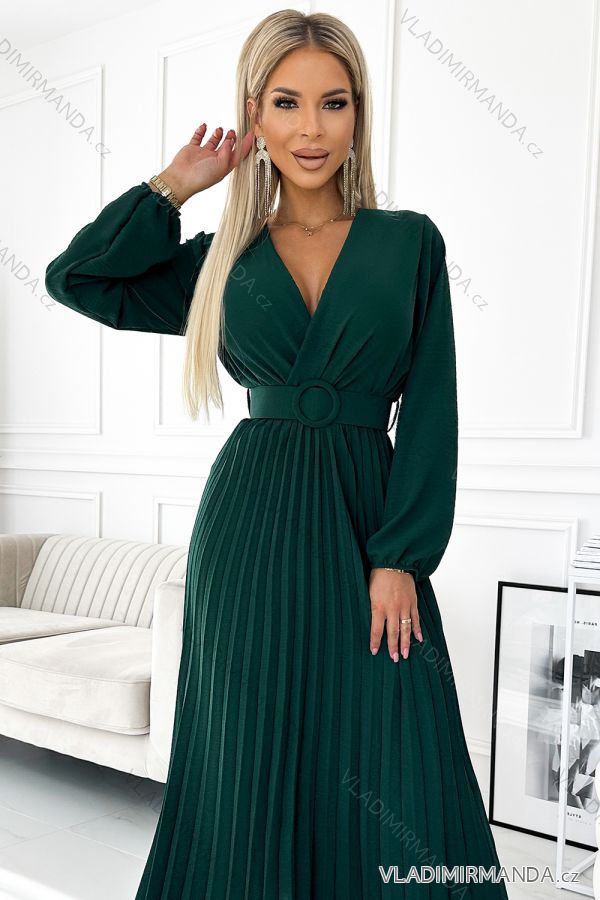 WAREN (120237) > Frauenkleidung (81449) > anziehen (30628) > Geselliges Ballkleid (4877) > Ballkleid lang (3130) > 504-3 VIVIANA Plissiertes Midikleid mit Ausschnitt, langen Ärmeln und breitem Gürtel – grün