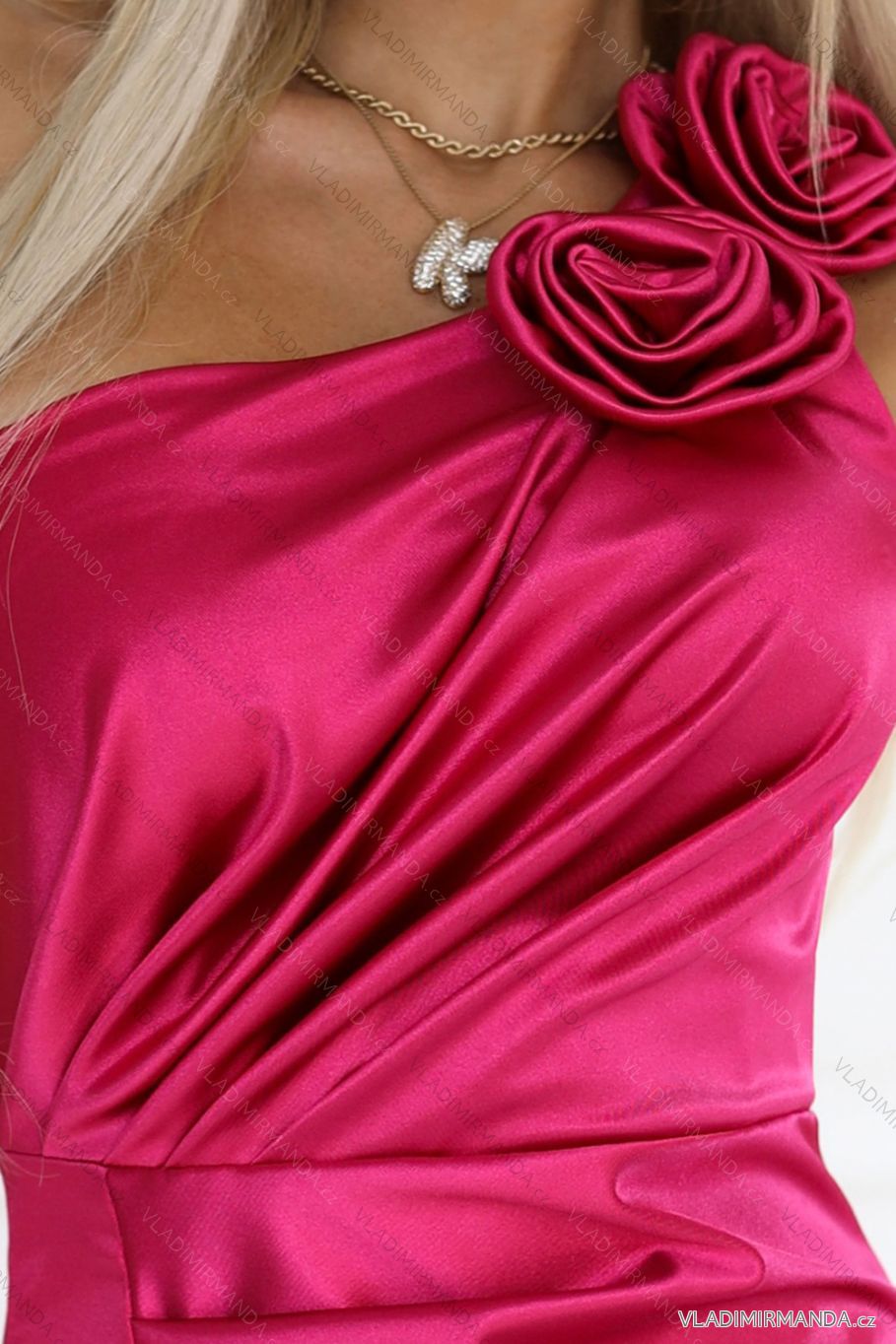 Spektakulär und feminin das ist das Aurora-Kleid aus glattem, schimmerndem Satin in intensivem Pink. Das asymmetrische One-Shoulder-Design mit einer auffälligen Rose auf der Schulter verleiht Romantik und Originalität. Drapierungen an Brust und Taille betonen die Silhouette, während der Beinschlitz das Bein bei jedem Schritt dezent enthüllt.