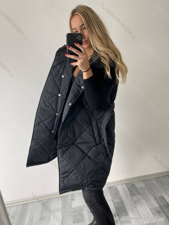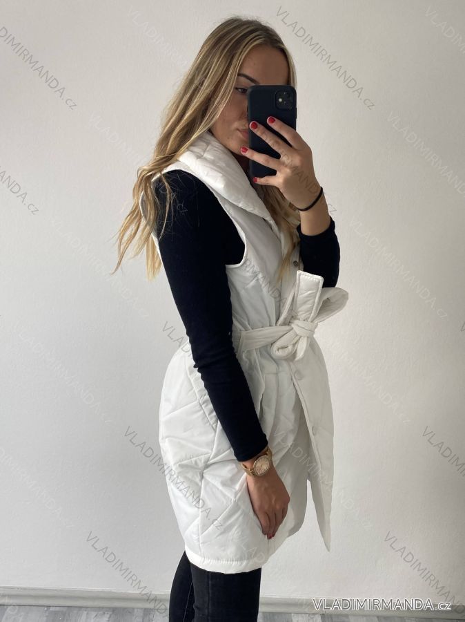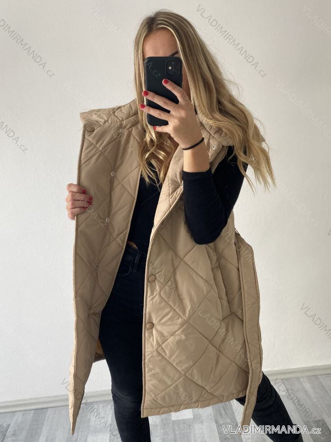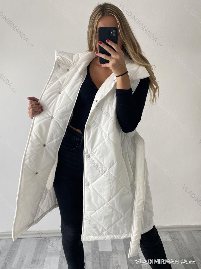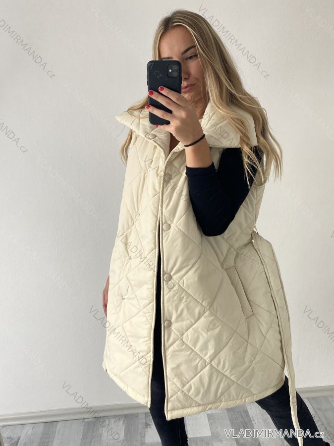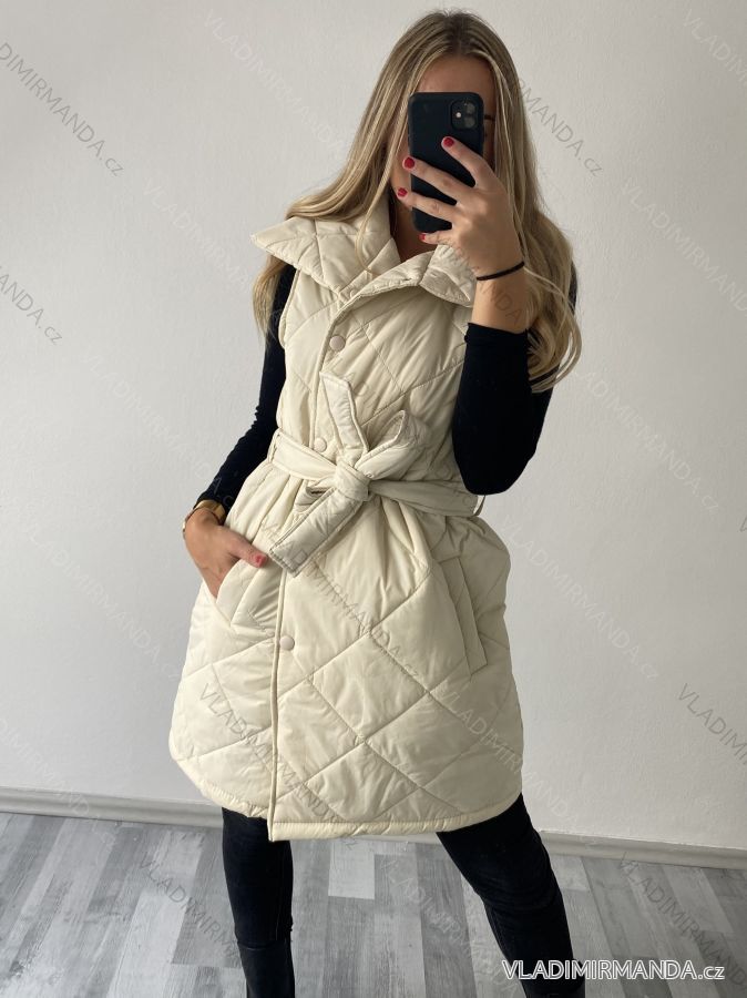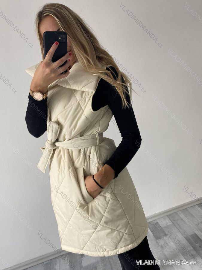 Ärmellose Damenweste mit Taschen, um den Hals mit Kragen, in der Taille mit Gürtel, Verschluss mit Druckknöpfen